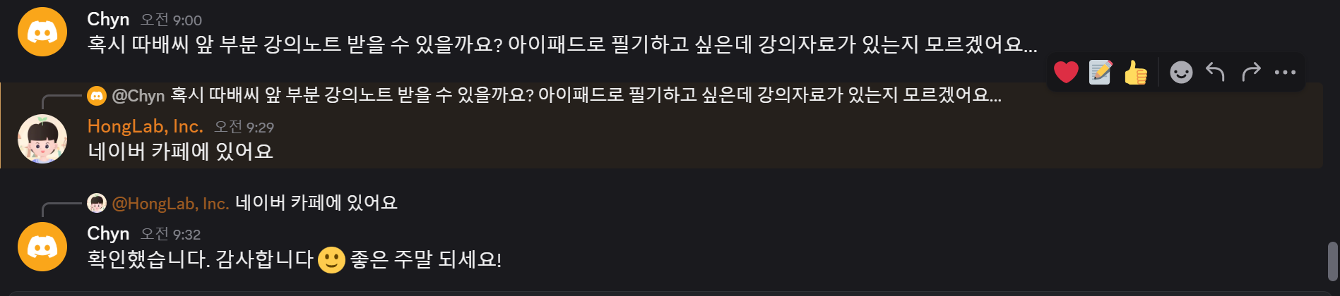 그래서 따배씨를 어제 결제하였고 열심히 수강 중입니다. 대학교에서 강의노트를 다운 받아서 필기하던 때가 생각나서, 자료를 찾기 위해 디스코드로 질문하였습니다.